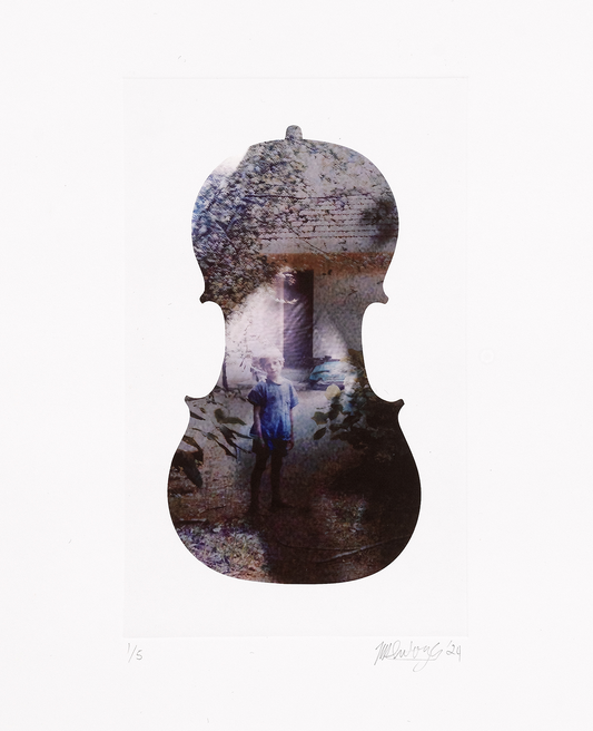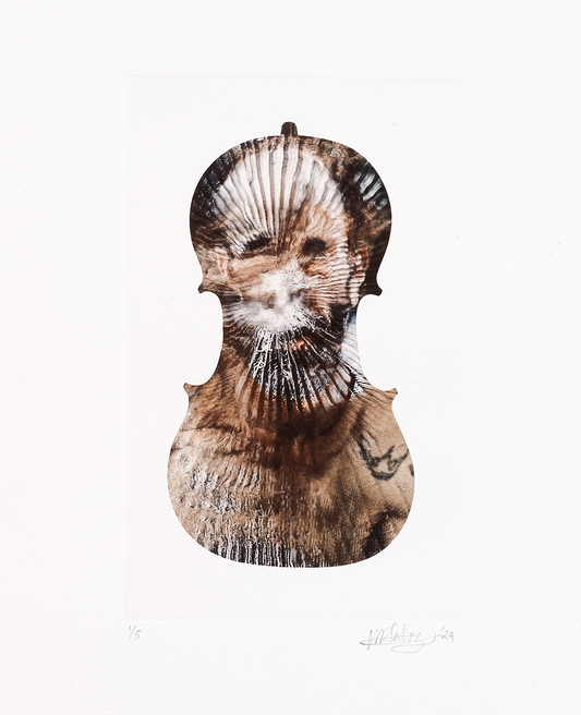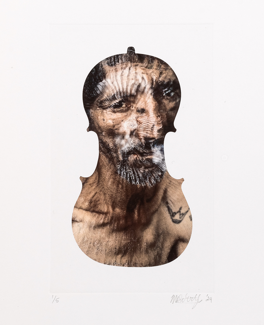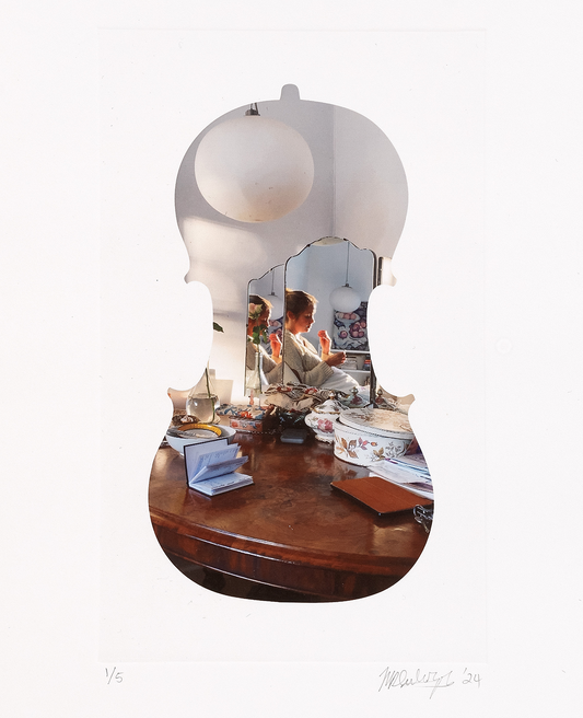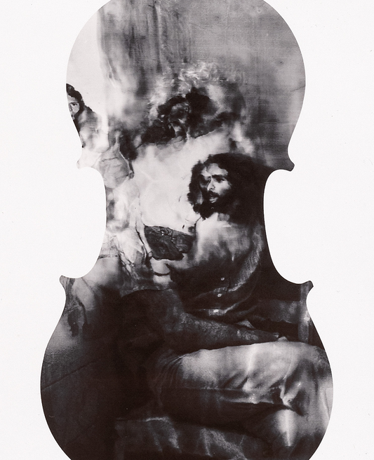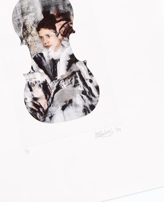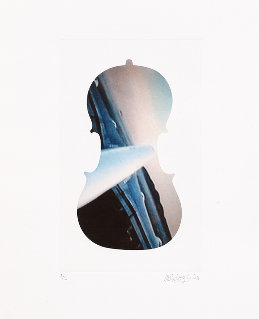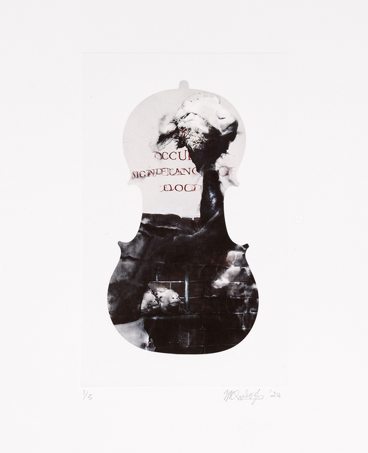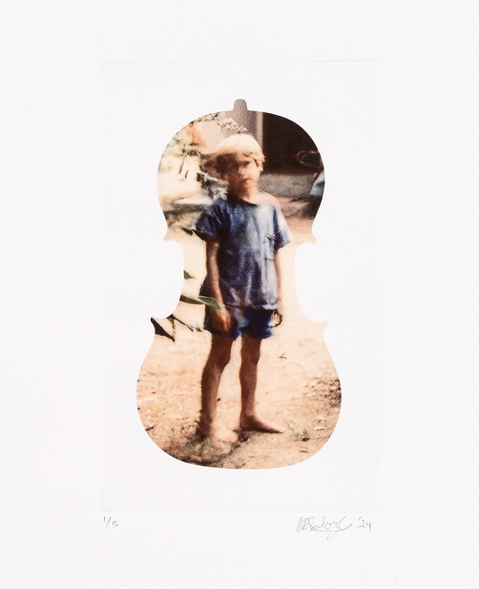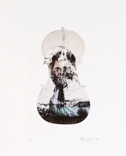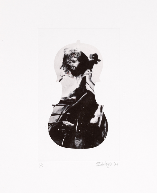 Subotzky’s latest print series is taken from his 2024 film installation ‘Cello Piece (or The Occult Significance of Blood)’. The film, which is projected onto a cello of sentimental significance, contains shattered and splintered images from Subotzky’s archive that are constantly melting into one another through a counterintuitive use of contemporary AI tools.
